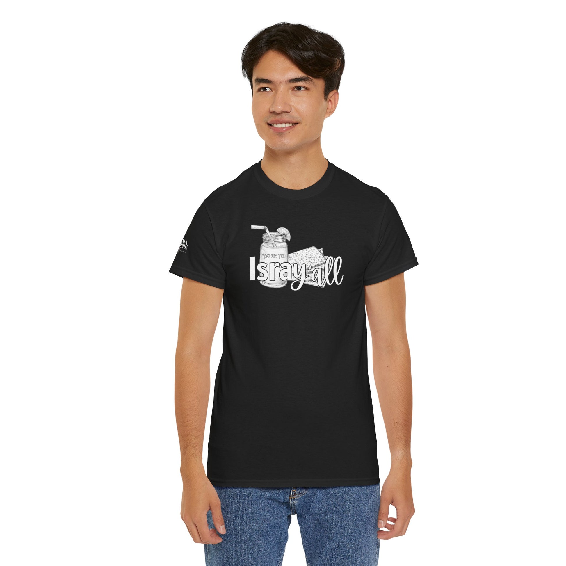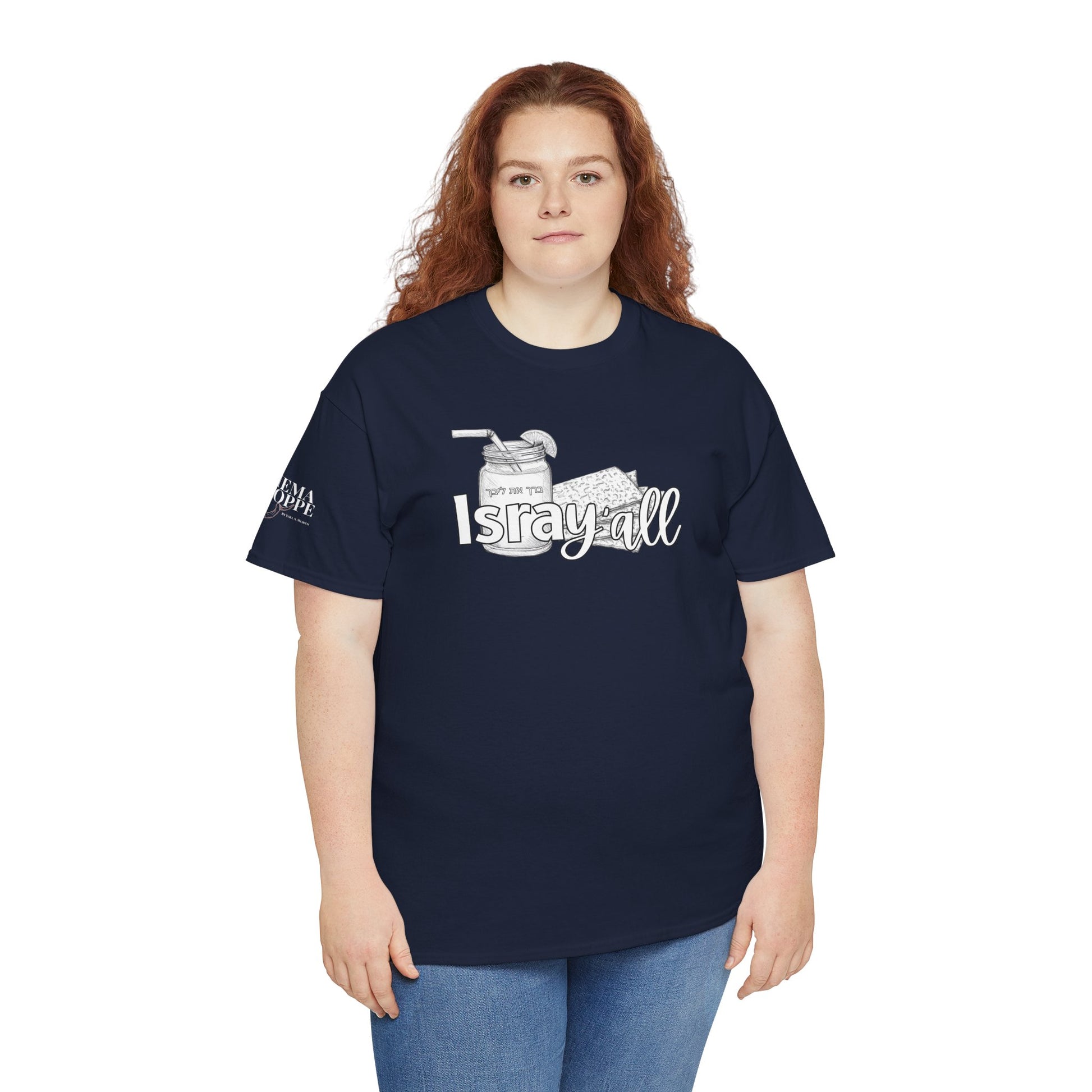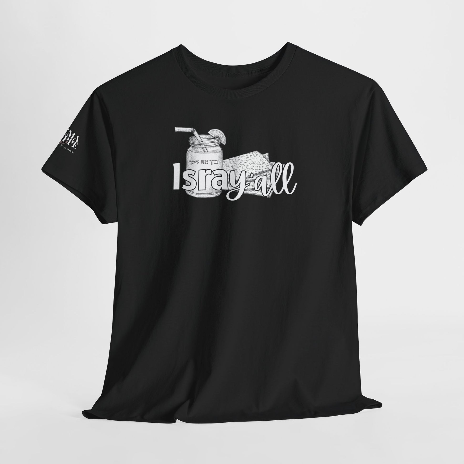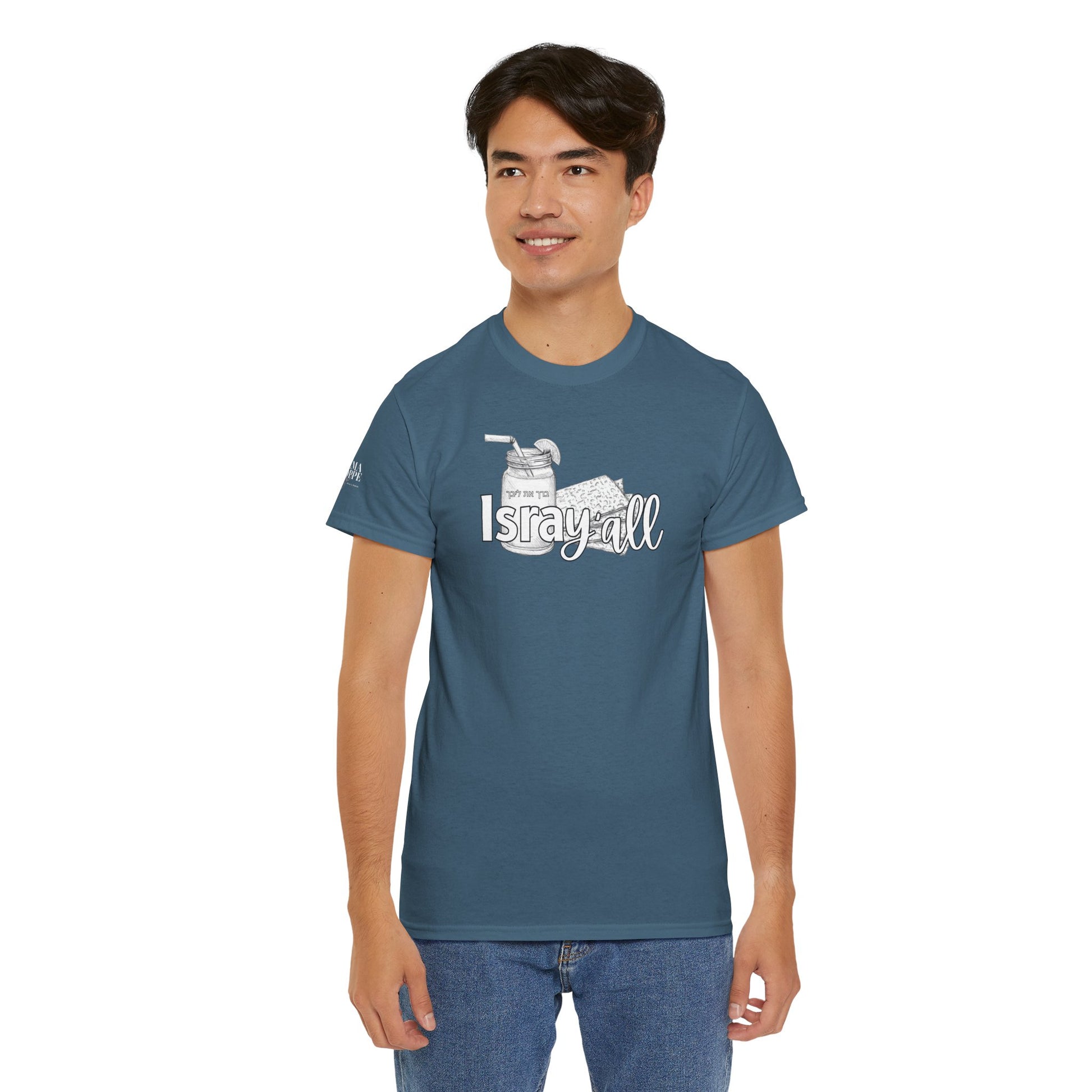 This funny IsraY'all cotton shirt combines Southern and Hebrew elements, featuring ice tea and matzo. It offers a quirky and playful vibe, perfect for those who appreciate humor and unique cultural mashups. Ideal for those looking to stand out with a conversation starter piece. Relevant for feasts like Passover, Shabbat, or casual wear with a twist.