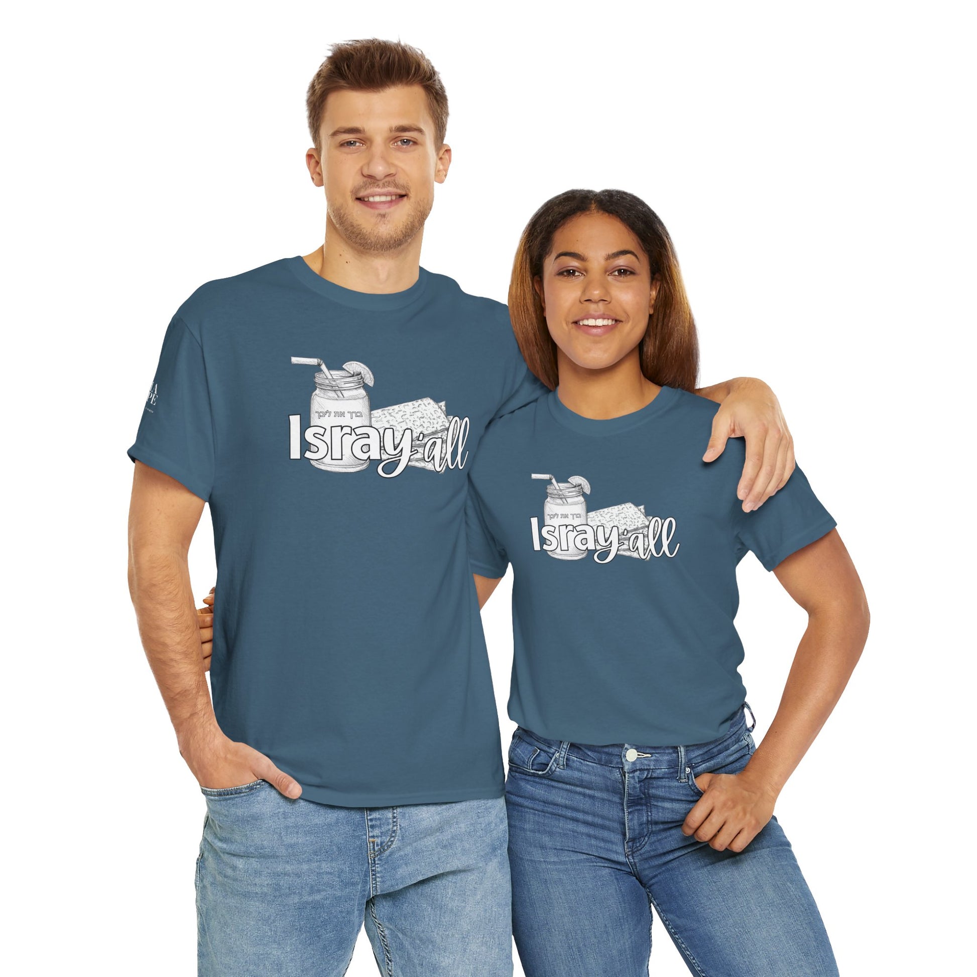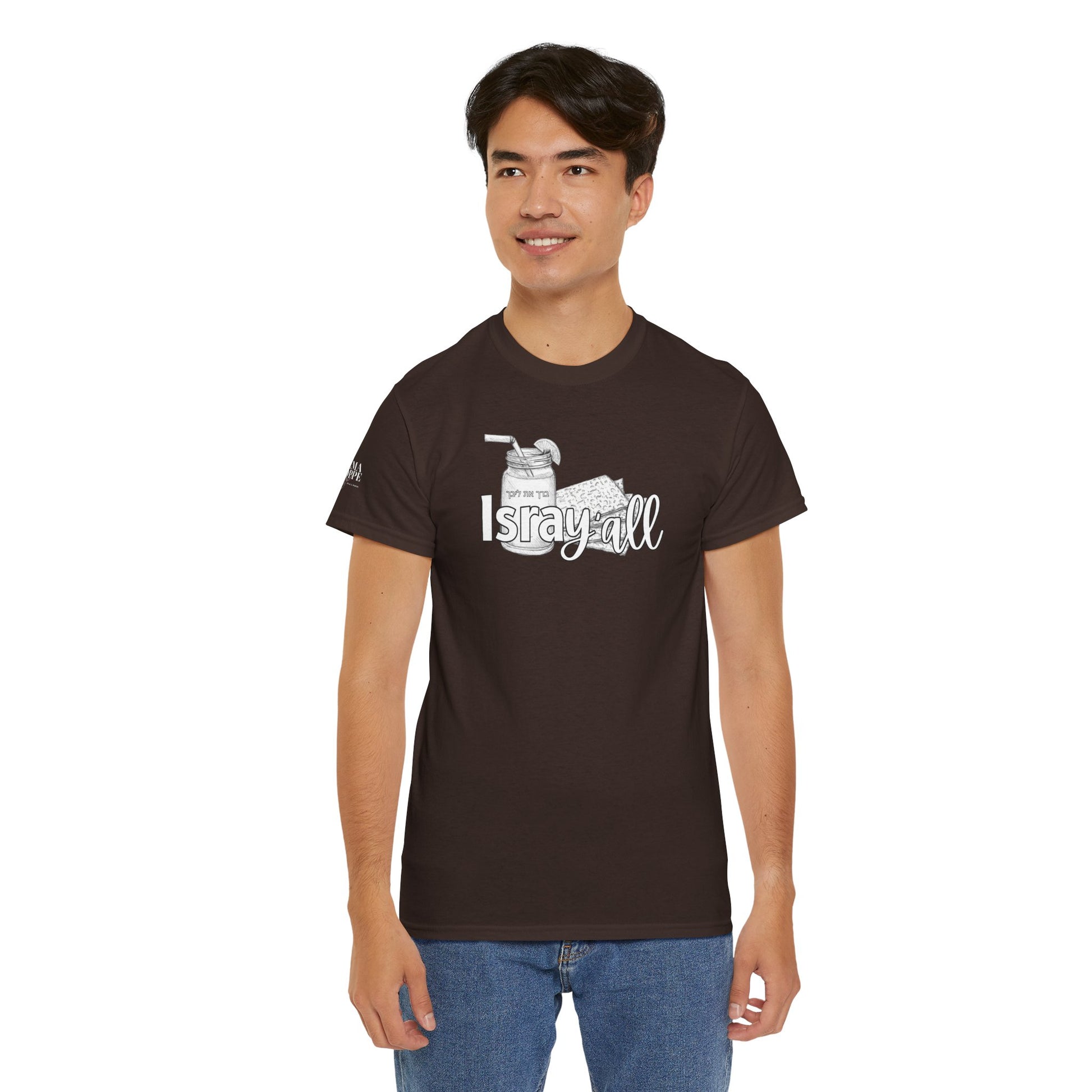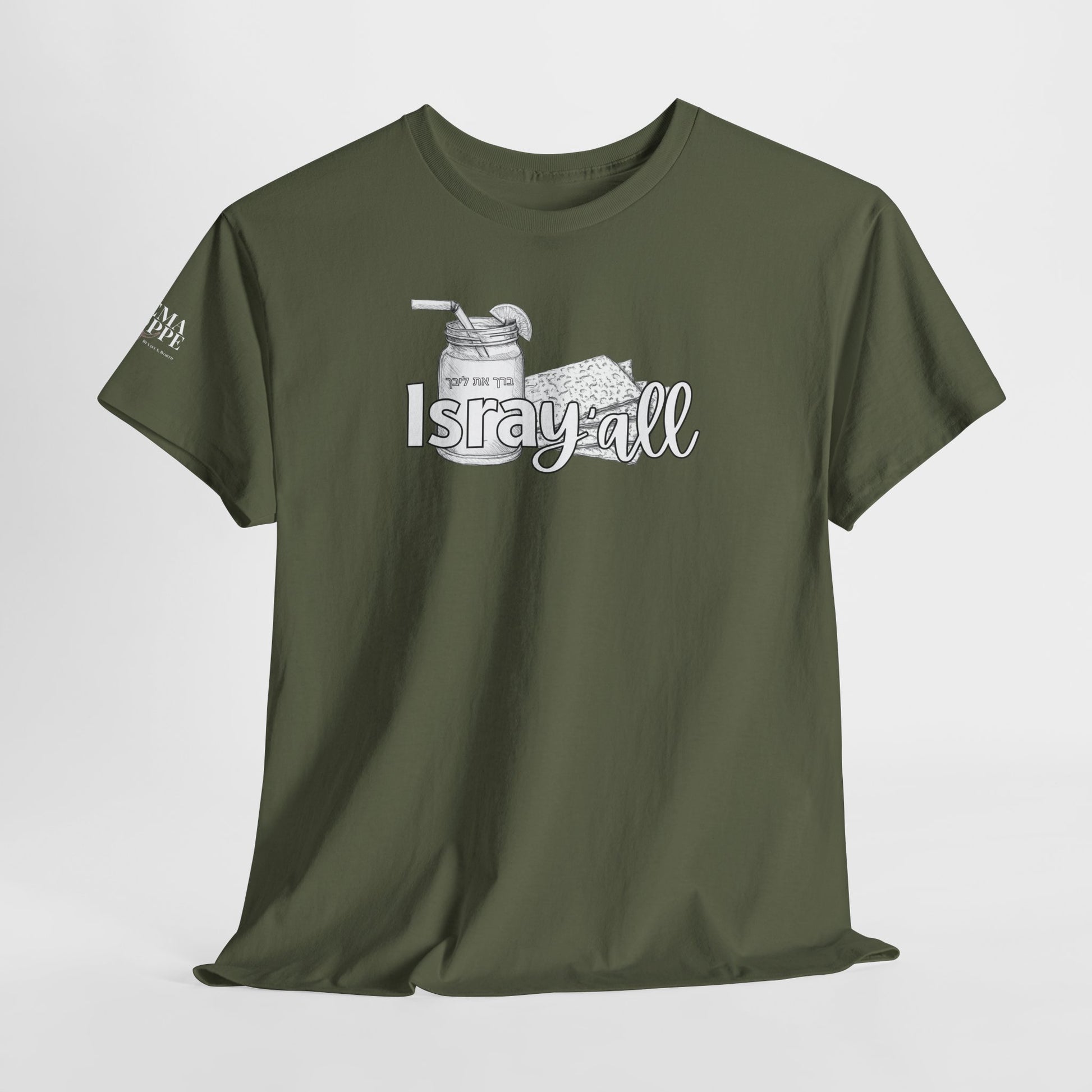 This funny IsraY'all cotton shirt combines Southern and Hebrew elements, featuring ice tea and matzo. It offers a quirky and playful vibe, perfect for those who appreciate humor and unique cultural mashups. Ideal for those looking to stand out with a conversation starter piece. Relevant for feasts like Passover, Shabbat, or casual wear with a twist.
