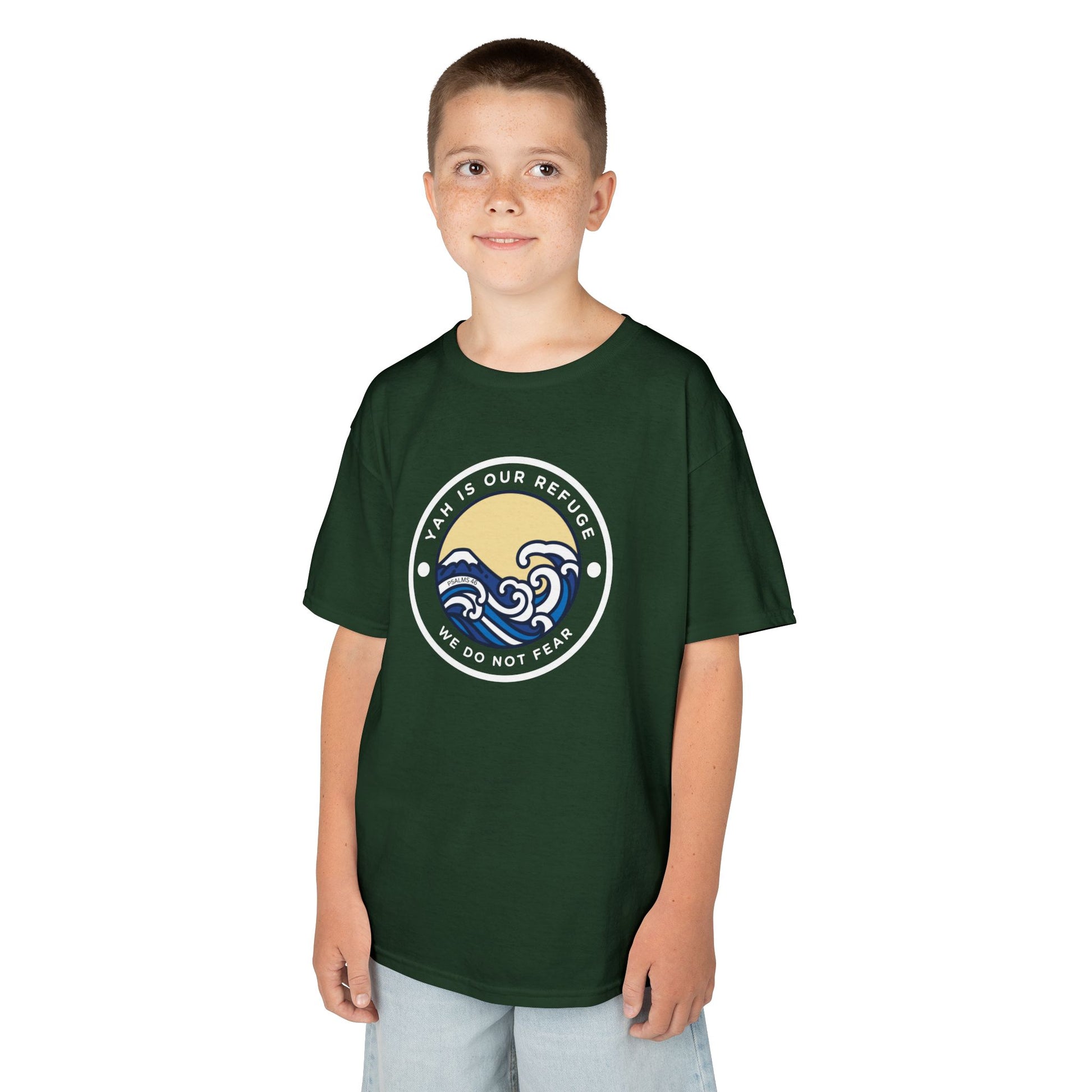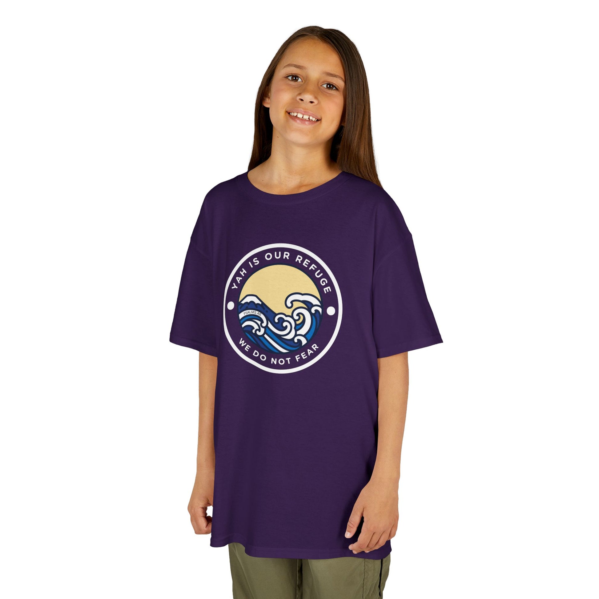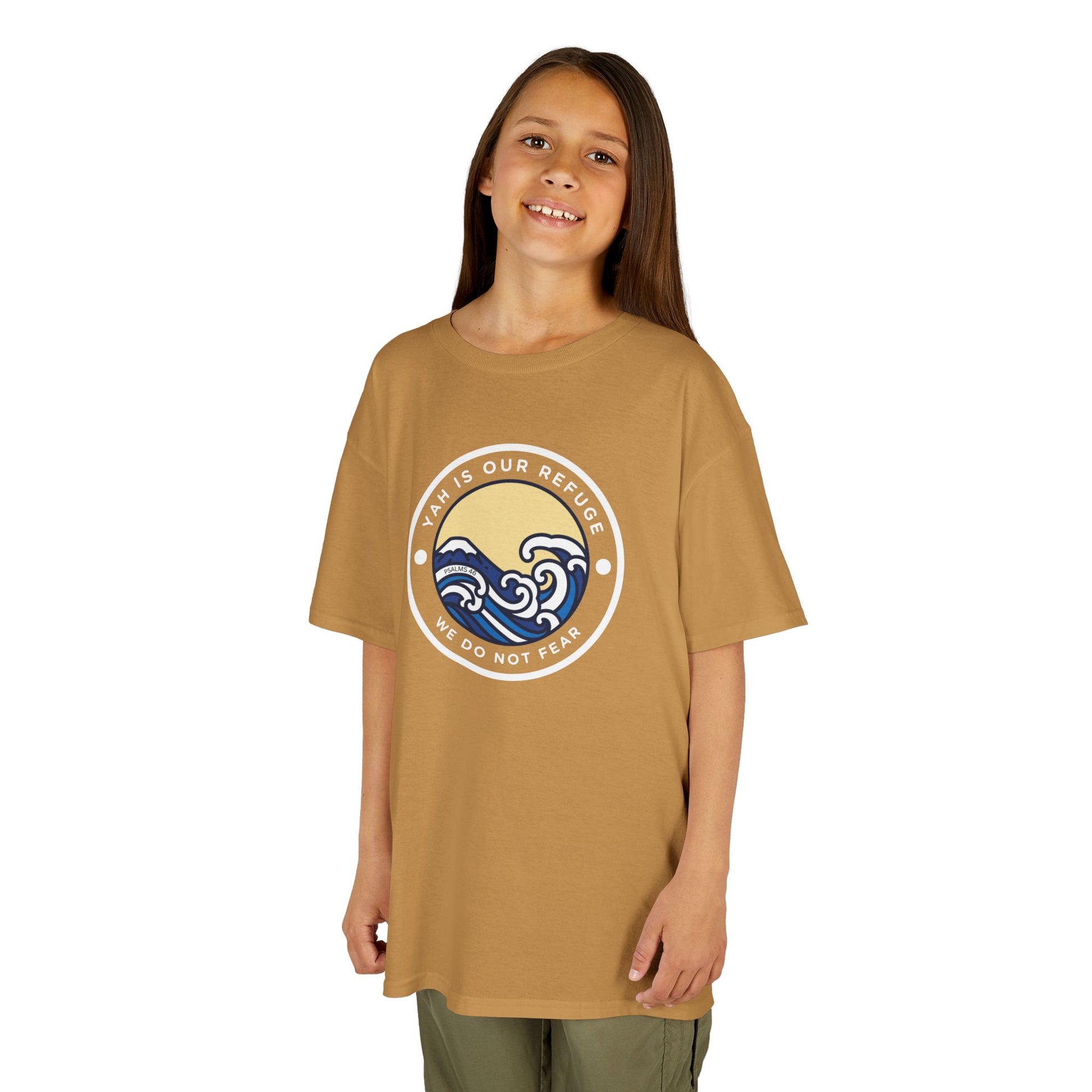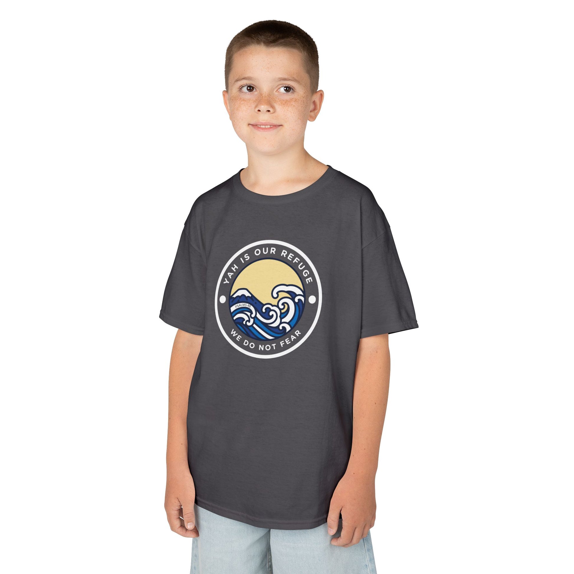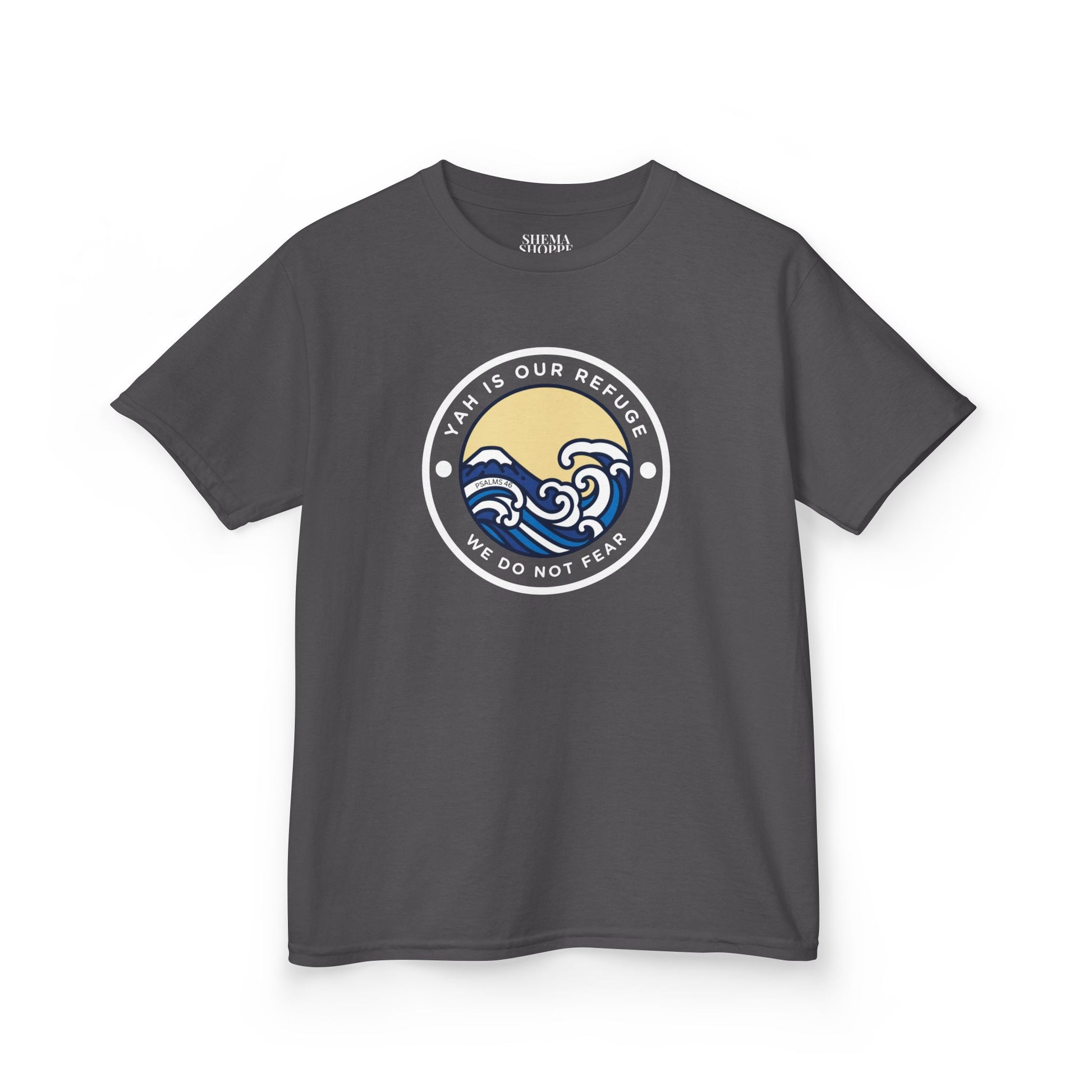 A Psalm 46 We Do Not Fear biblical shirt for Kids, perfect for young ones to express their faith. The design exudes positivity and strength, making it a great addition to a child's wardrobe. Ideal for biblical feasts, school activities, fellowship gatherings, or everyday wear for kids who want to share their beliefs.