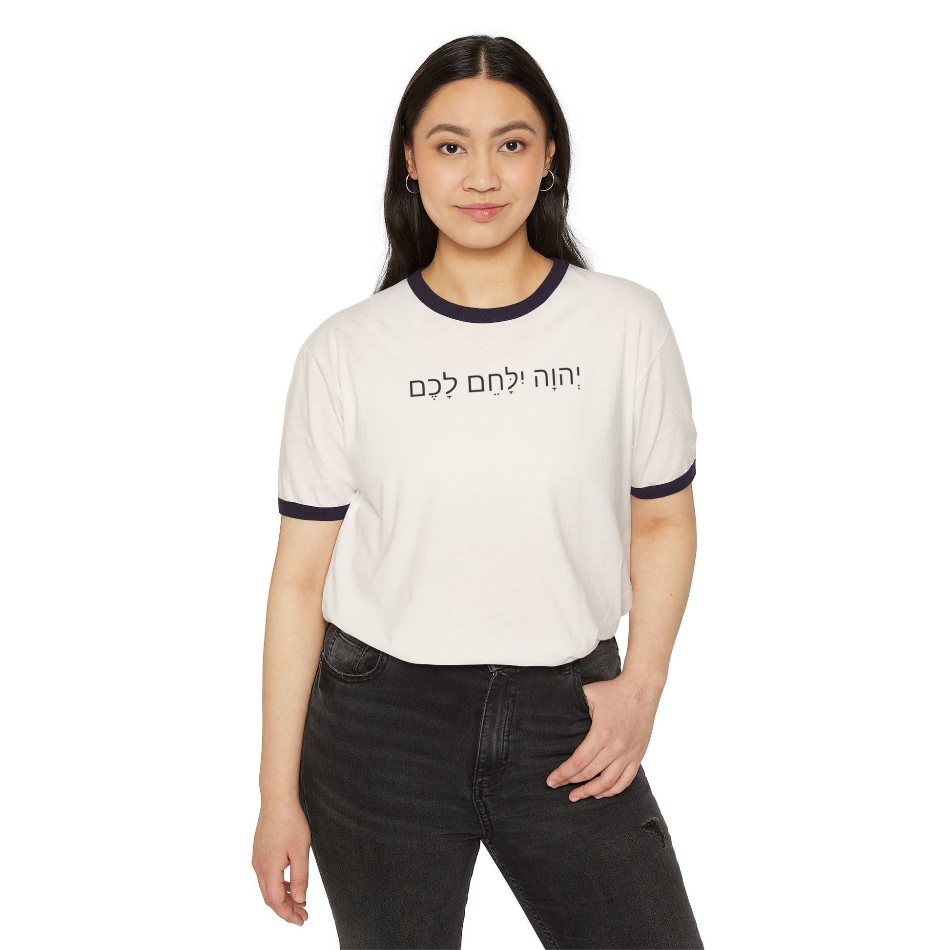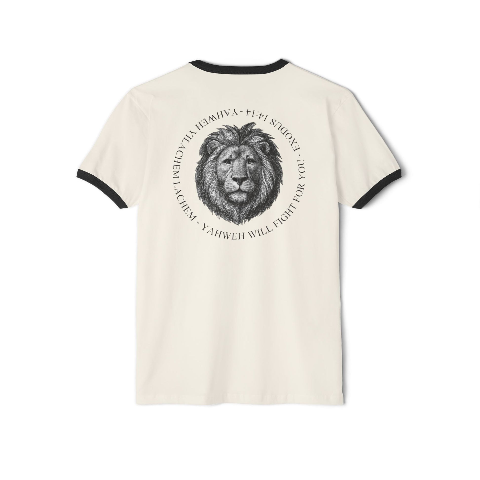 Ringer T-Shirt — Hebrew 'Yahweh Will Fight For You' with Lion Graphic Exodus 14:14