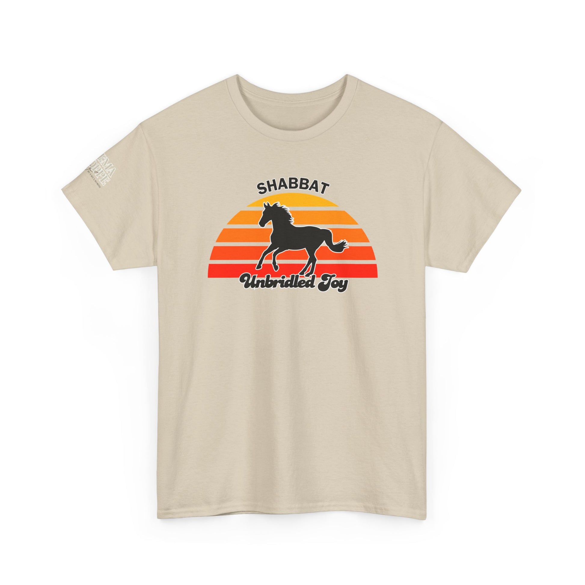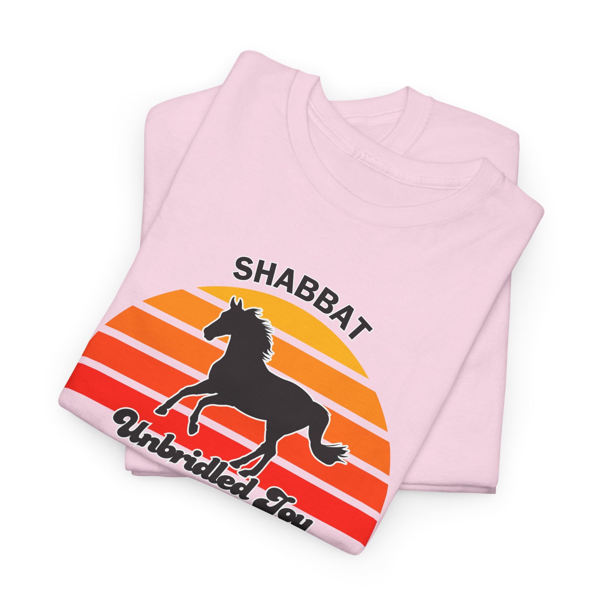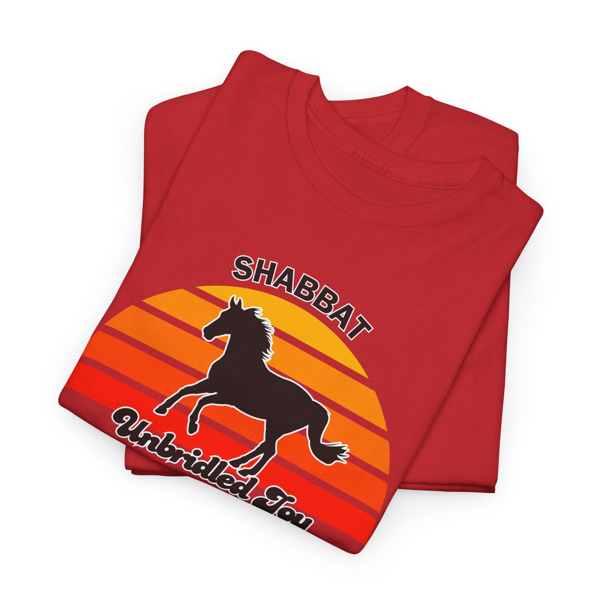 Shabbat Unbridled Joy Tee — Retro Horse Sabbath Sunset T‑Shirt