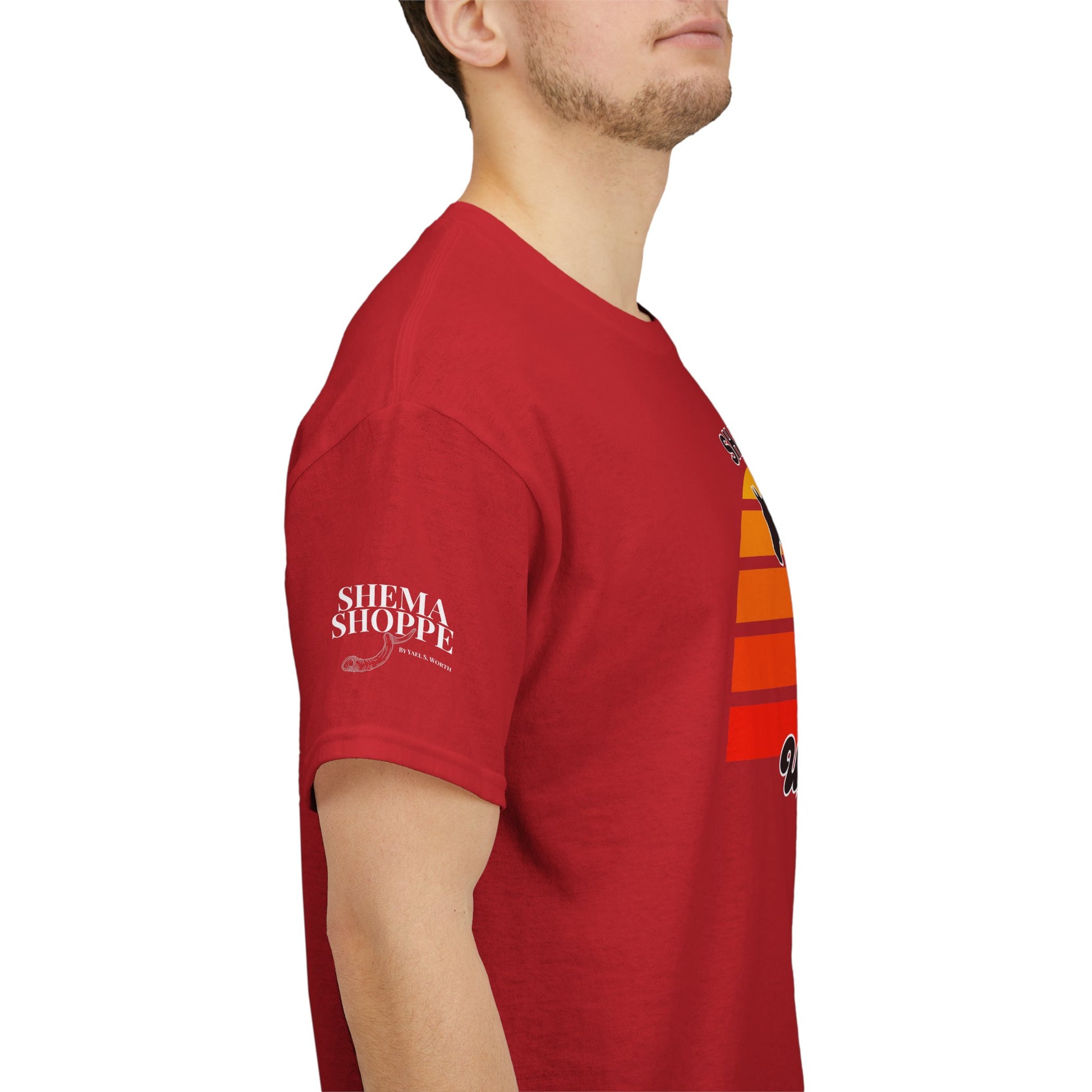 Let the slow, golden calm of Shabbat ride into your weekend. This soft, classic tee wears like a lived-in favorite — light, breathable cotton with a relaxed crew neck. A warm retro sunset sits behind a joyful horse silhouette and the words “Shabbat Unbridled Joy,” a simple image that carries a quiet, celebratory energy. Wear it to Friday night dinners, neighborhood walks before sundown, or while setting the table and lighting candles. The design feels like comfort and ritual stitched together: gentle, unhurried, and familiar. It blends well with denim, a cozy cardigan, or a shawl — pieces people who keep a slower rhythm reach for when they want to feel grounded and seen.
