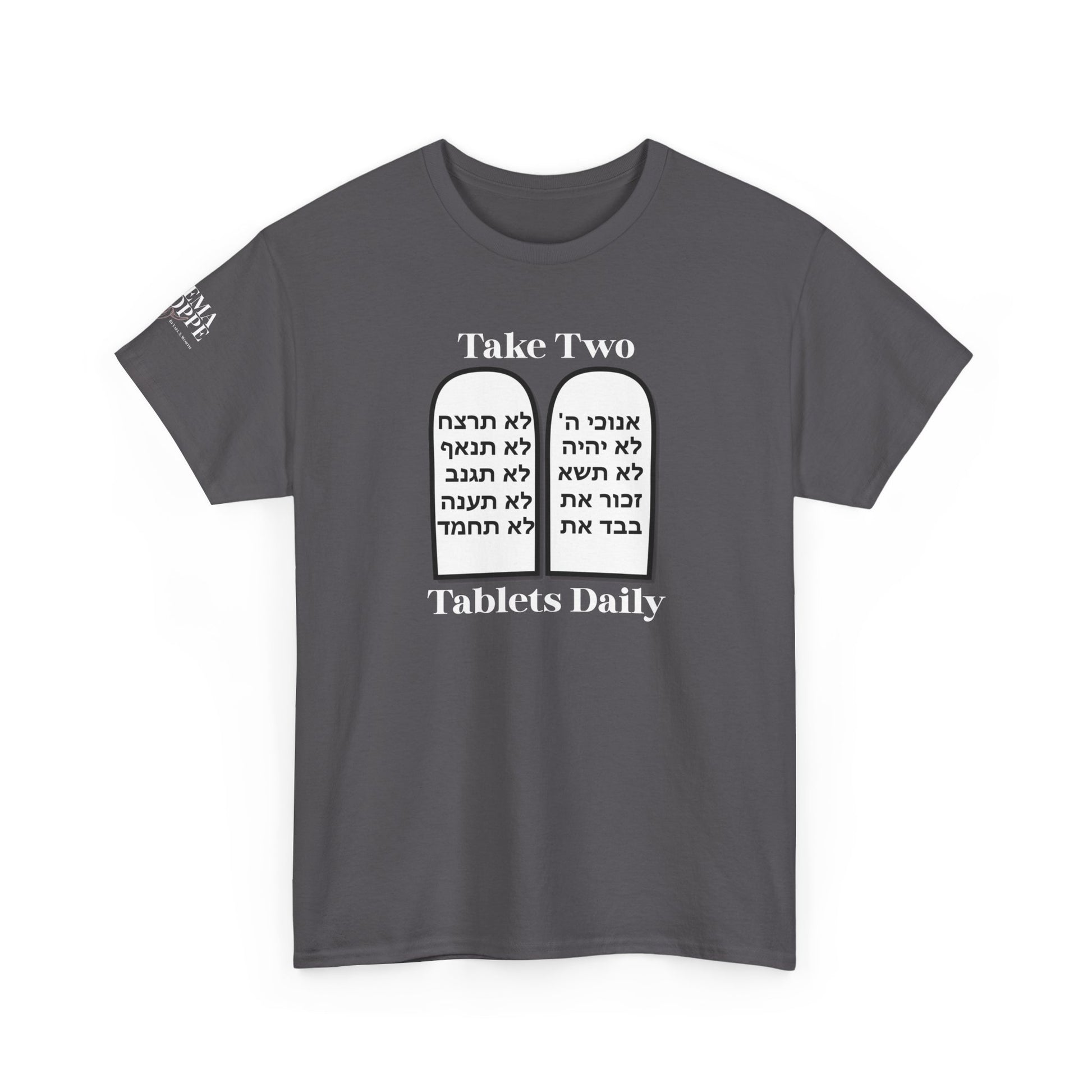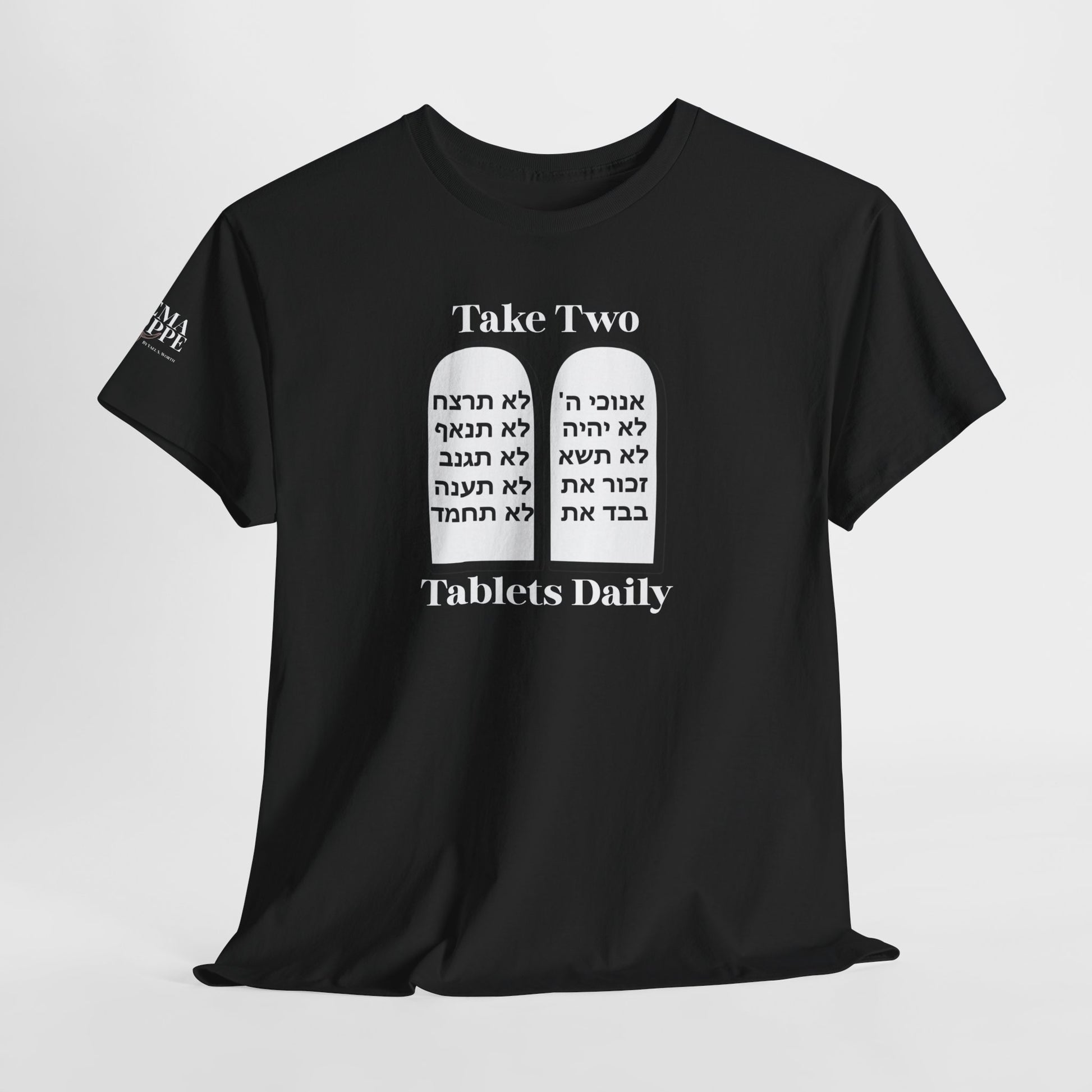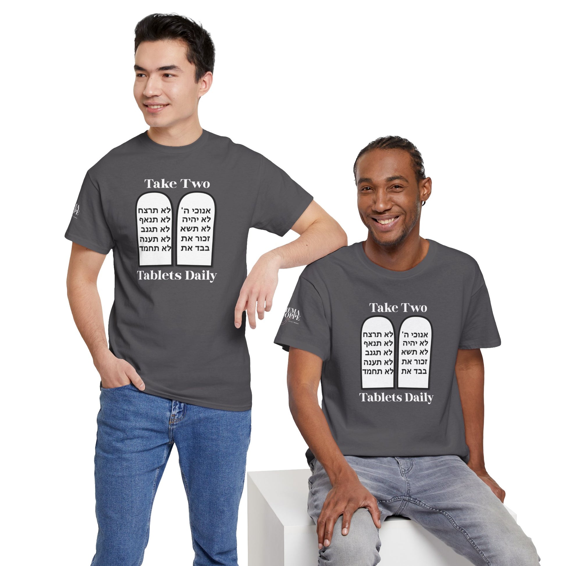 This 'Take Two Tablets Daily' commandments T-shirt is perfect for those looking to add a touch of humor and truth to their wardrobe. With its classic fit and comfortable fabric, it can be worn casually or semi-formally. Ideal for adults with a playful sense of style, this T-shirt is relevant for everyday wear, casual events, church, fellowship, shabbat and feast gatherings.