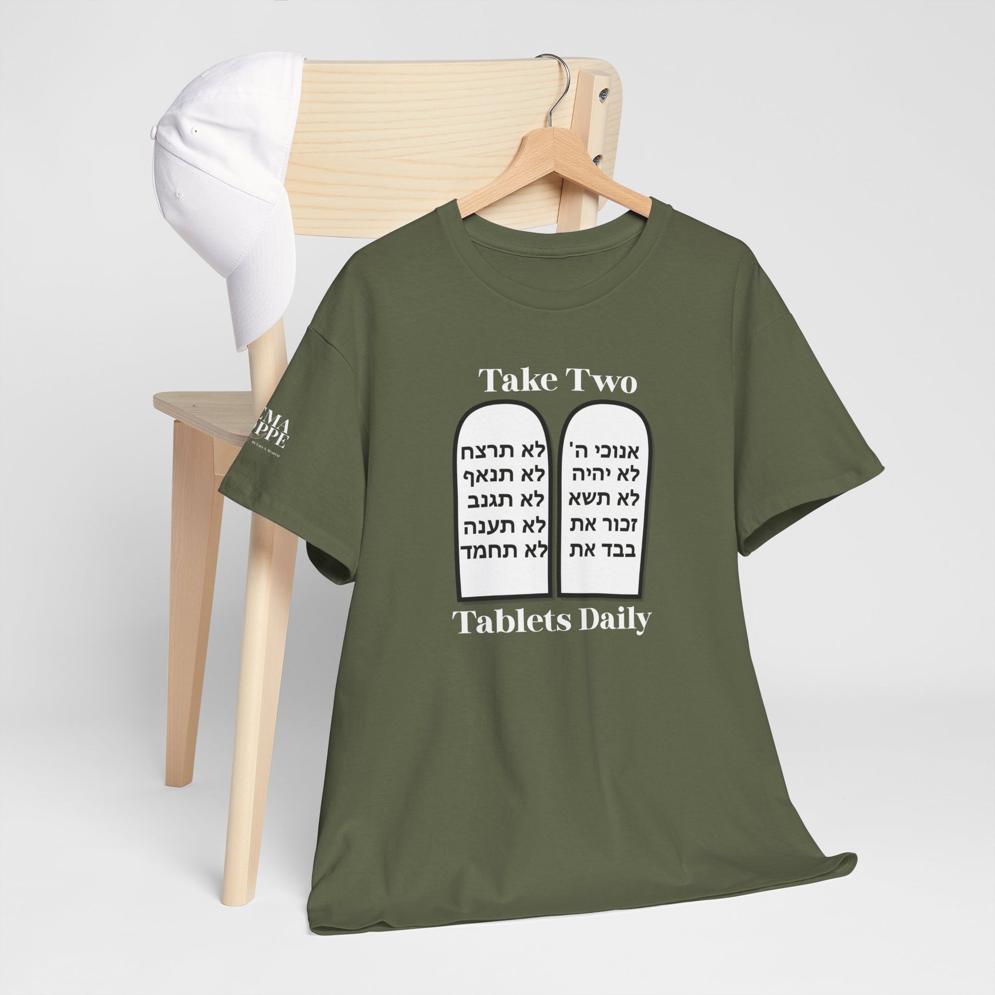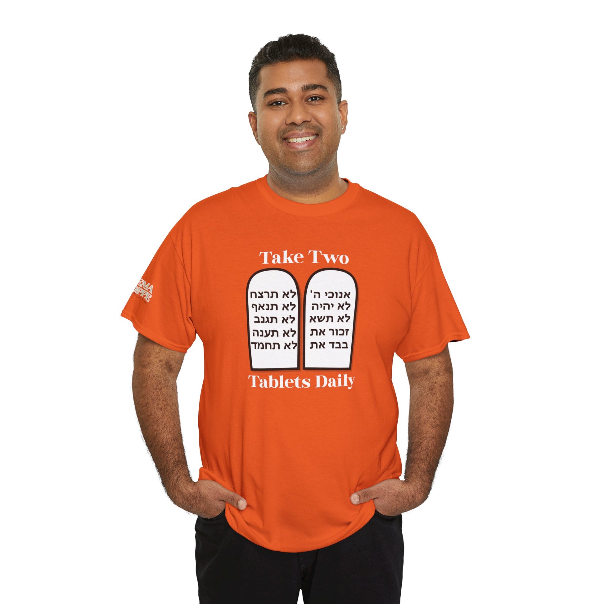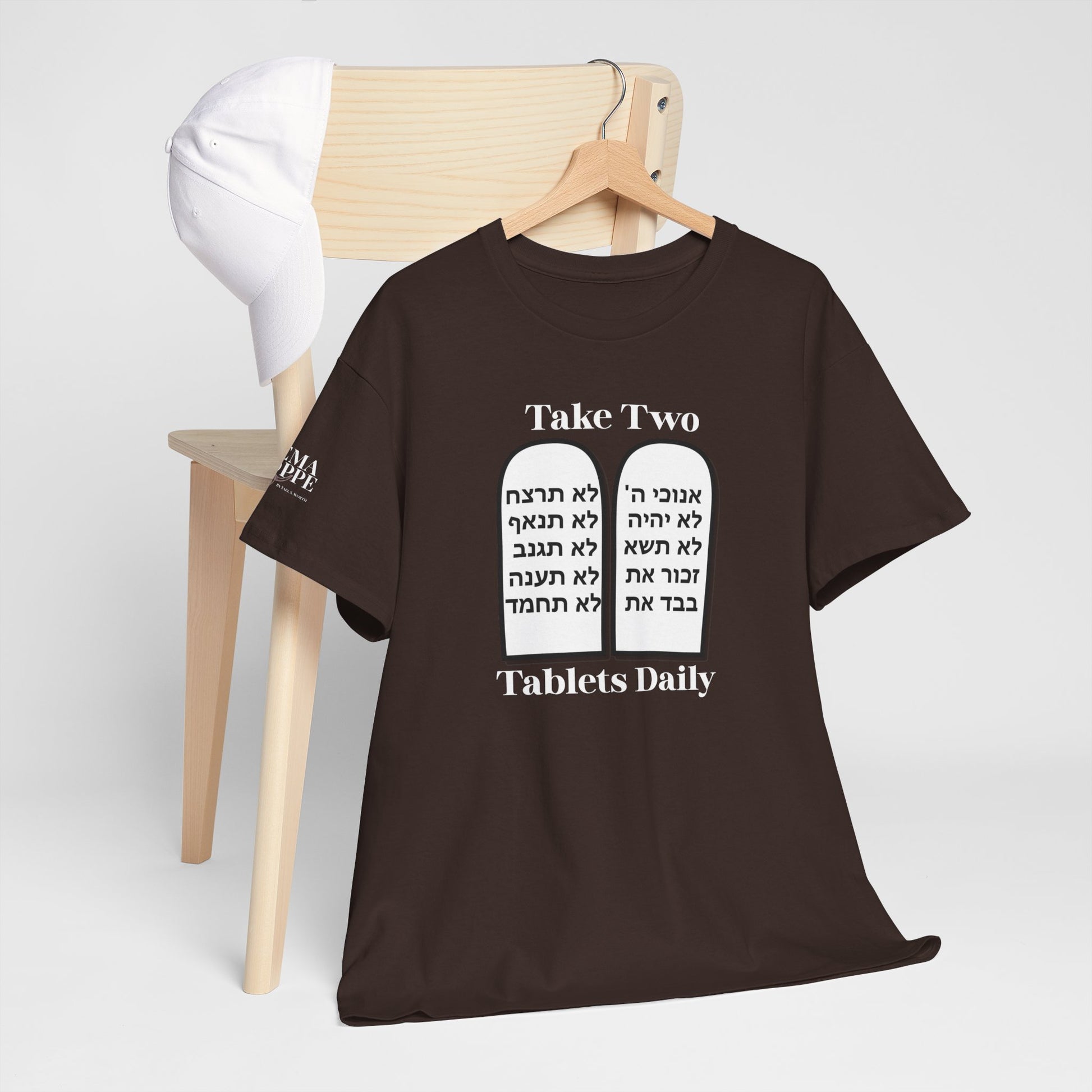 This 'Take Two Tablets Daily' commandments T-shirt is perfect for those looking to add a touch of humor and truth to their wardrobe. With its classic fit and comfortable fabric, it can be worn casually or semi-formally. Ideal for adults with a playful sense of style, this T-shirt is relevant for everyday wear, casual events, church, fellowship, shabbat and feast gatherings.